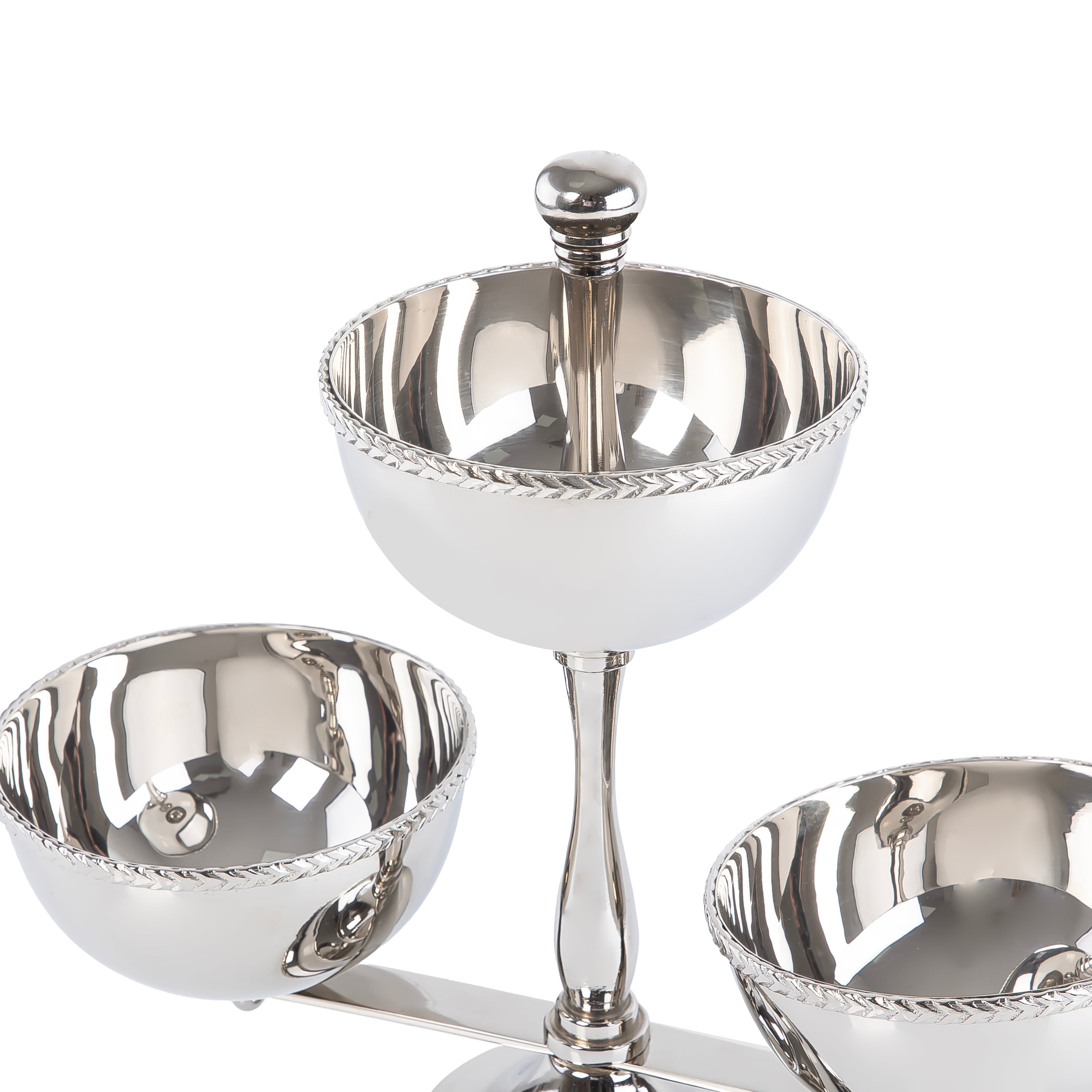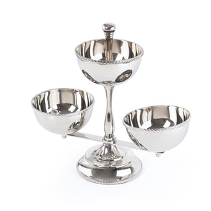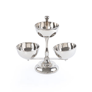 Elevate your table presentation with this sophisticated three-tier serving stand crafted from polished metal. Designed to maximize space while maintaining an elegant aesthetic, this stand accommodates multiple serving bowls simultaneously, making it ideal for entertaining or buffet-style dining. The gleaming finish adds a refined touch to any occasion, whether hosting formal dinners or casual gatherings. Perfect for displaying appetizers, desserts, or condiments with style and organization.