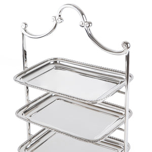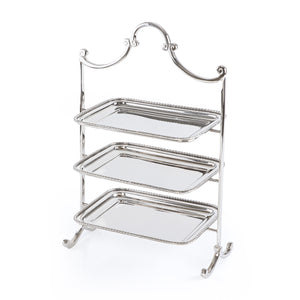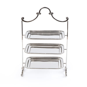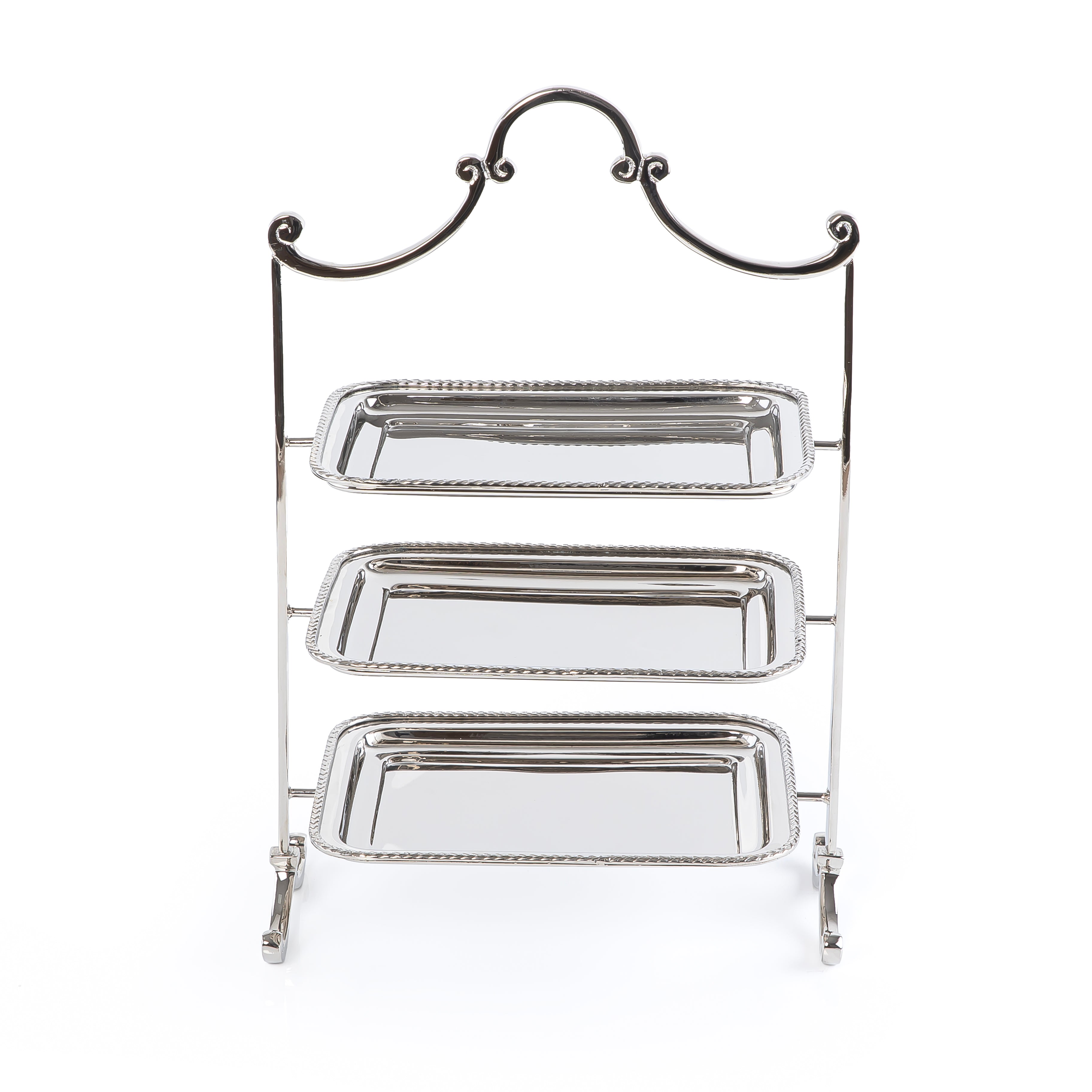 A stainless steel serving stand with three elevated tiers, offering a practical design for an organized presentation.