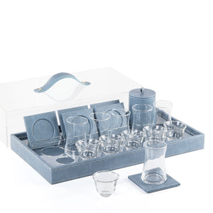 A wooden serving tray covered with leather, featuring a clear acrylic lid and a convenient handle. The set includes 6 tea cups, 6 coffee cups, and comes in a gift box.