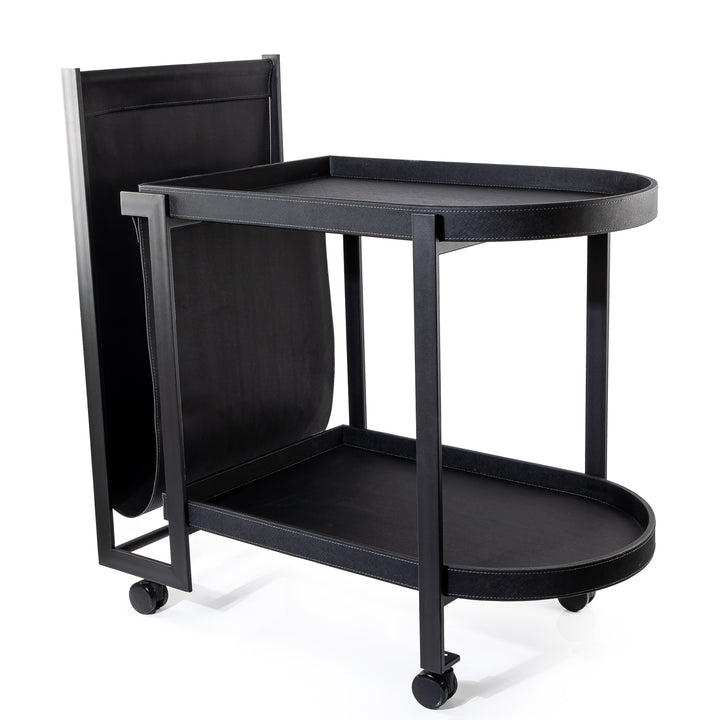 Expertly crafted, this leather trolley with 2 semi oval shape shelves offers both style and functionality. The sleek design is perfect for any setting, while the durable leather material ensures long-lasting use. Keep your items organized and easily accessible with this versatile and elegant trolley.