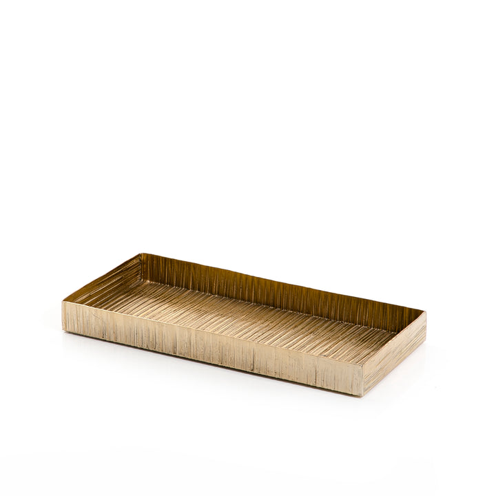 A refined gold rectangular metal tray designed for both elegance and practicality. Ideal for serving, organizing, or displaying decorative items, this tray brings a clean, modern touch to any space with its shiny finish and timeless shape.