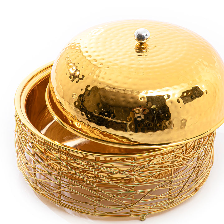 An elegant round food preserver made entirely of gold-toned metal, designed to keep your food fresh while enhancing your table with a luxurious touch. Perfect for special gatherings or everyday use, this piece combines style, durability, and practicality.