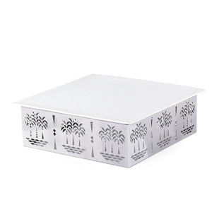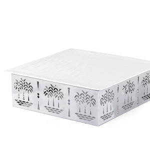 Elegant serving stand with decorative Islamic. , creating an artistic border around the base. The flat square top provides a stable surface for serving or display purposes. Perfect blend of functionality and traditional Islamic artistic elements.