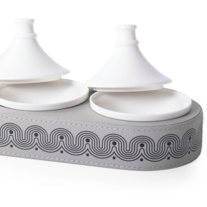 Leather Oval stand with 3 Pyramid-Shaped Ceramic Bowls