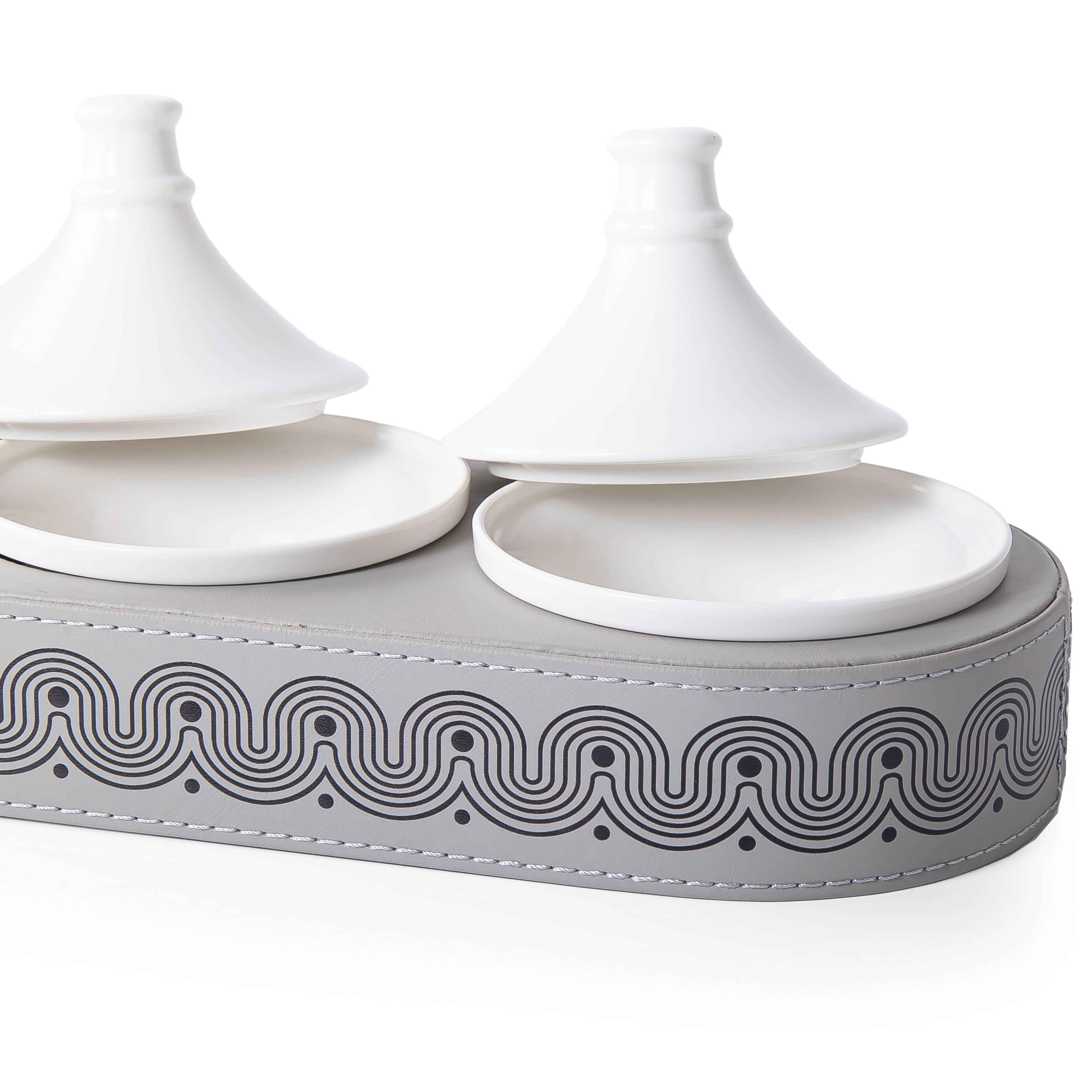 Chose the option: Leather Oval stand with 3 Pyramid-Shaped Ceramic Bowls