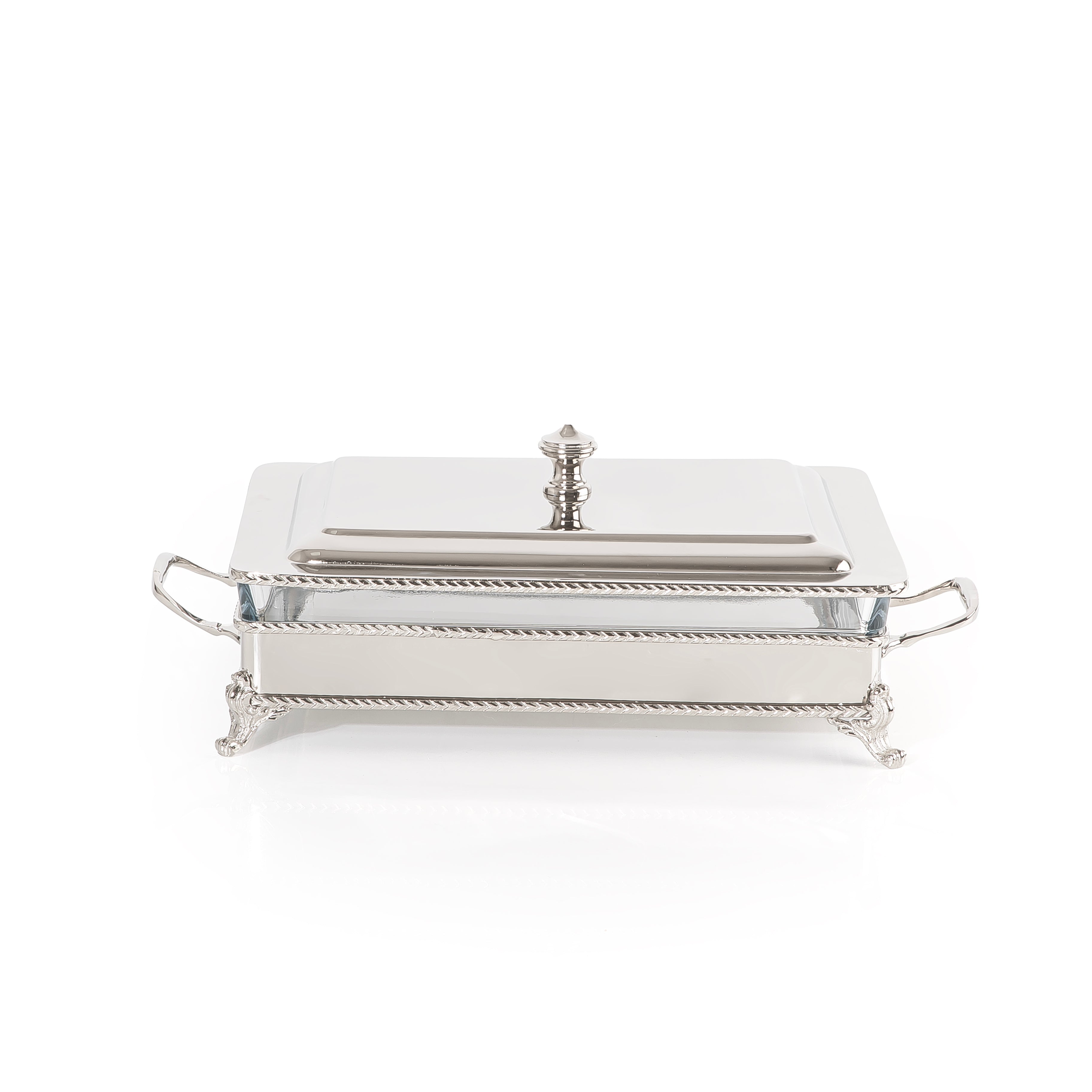 Bring elegance and functionality to your dining experience with this Silver Stainless Steel Rectangular Chafing Dish, featuring a removable interior glass bowl for versatile serving.