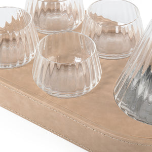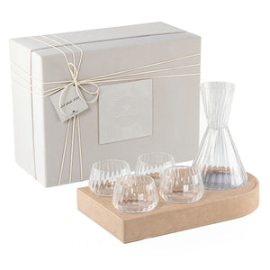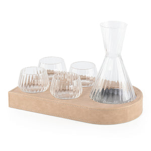 This set includes 4 glasses, a matching jug, and a stylish leather tray, all packaged in a beautiful gift box. It's perfect for serving drinks and makes an elegant gift or addition to your home.