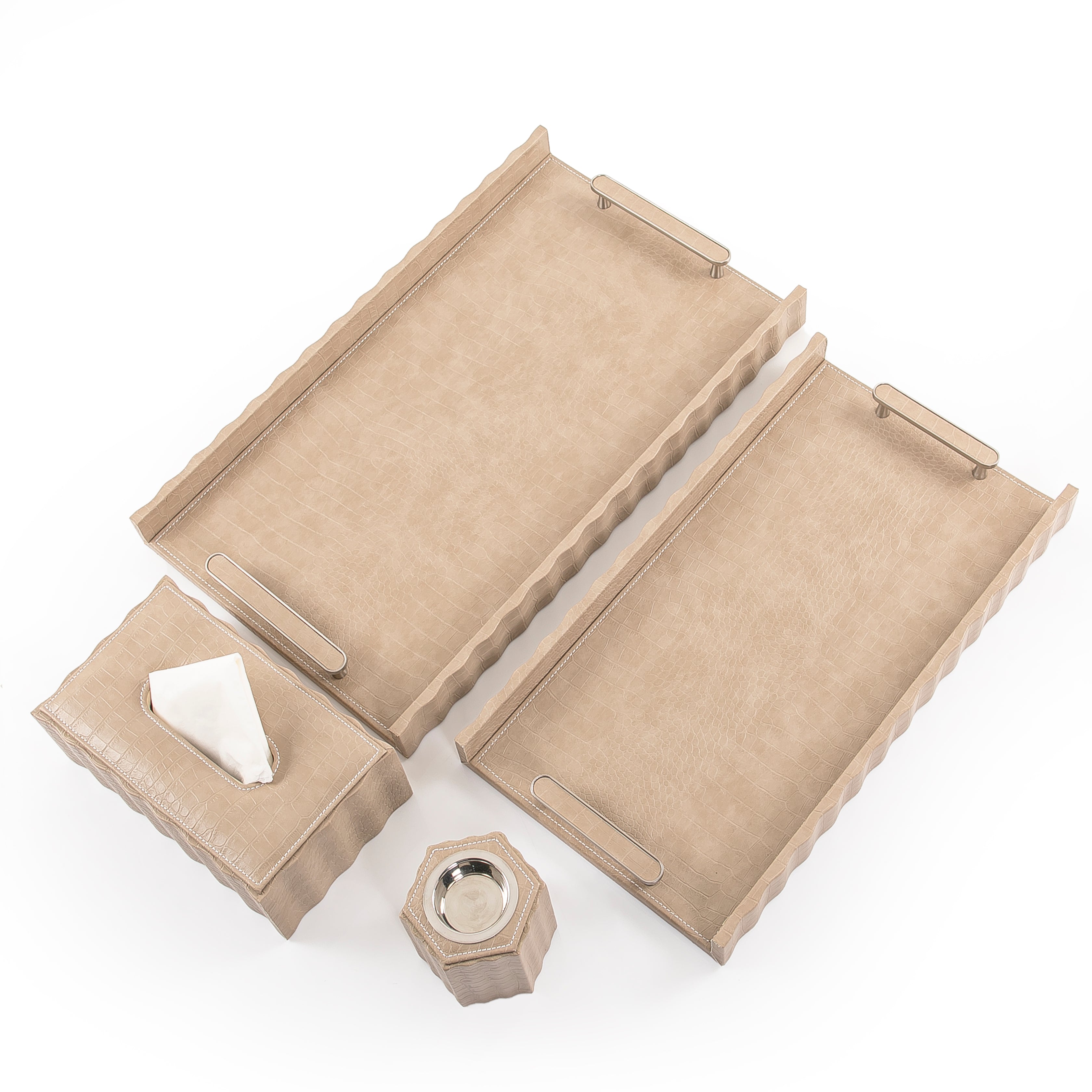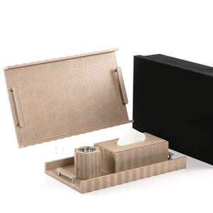 This set will be a great addition to every home as it contains a leather of 2 trays, tissue box and incense burners bought to you by a gift box.