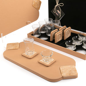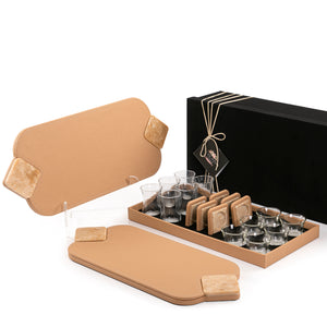 Set of 2 leather trays with cups and coaster with gift box