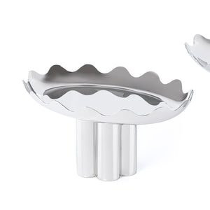 Elevate your table presentation with this sophisticated set of two metal serving stands featuring elegant wavy edges. Crafted in lustrous silver, these versatile pieces complement both contemporary and classic dining aesthetics. The sturdy metal construction ensures reliable support for appetizers, desserts, or decorative displays. Perfect for entertaining or gifting, each stand showcases refined detailing that adds a touch of refinement to any occasion. Comes beautifully packaged in a gift box, making it an ideal present for the discerning host or hostess.