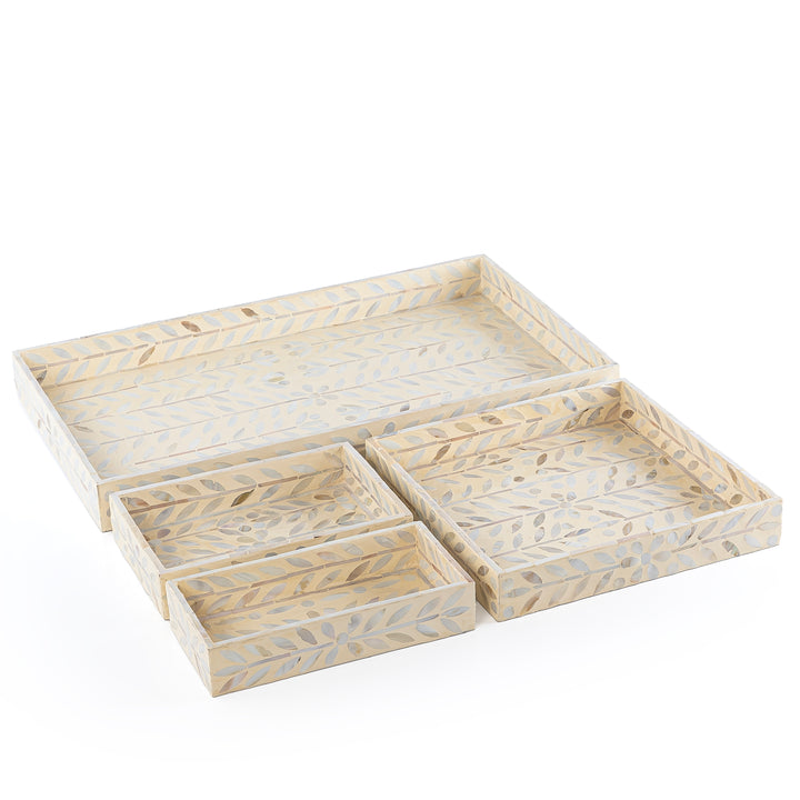 Elevate your home organization with this sophisticated mother-of-pearl tray set. Featuring four graduated sizes in elegant beige, each piece showcases the lustrous, iridescent finish characteristic of premium mother-of-pearl. Perfect for displaying jewelry, organizing desk essentials, or serving refreshments, these versatile trays combine functionality with refined aesthetics. The natural variations in each tray's pearlescent surface ensure every set is uniquely beautiful. An ideal addition to contemporary or traditional interiors seeking understated luxury.