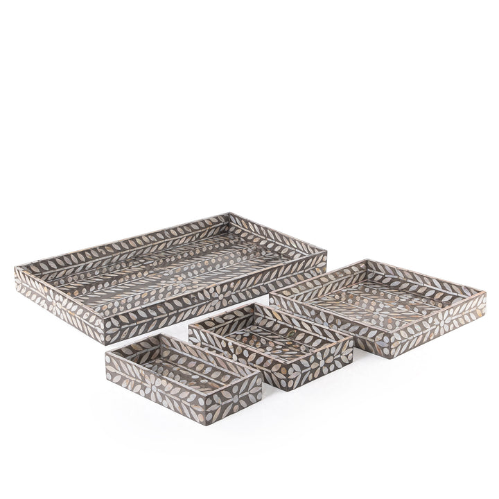 Elevate your home organization with this sophisticated mother-of-pearl tray set. Featuring four graduated sizes in elegant grey , each piece showcases the lustrous, iridescent finish characteristic of premium mother-of-pearl. Perfect for displaying jewelry, organizing desk essentials, or serving refreshments, these versatile trays combine functionality with refined aesthetics. The natural variations in each tray's pearlescent surface ensure every set is uniquely beautiful. An ideal addition to contemporary or traditional interiors seeking understated luxury.