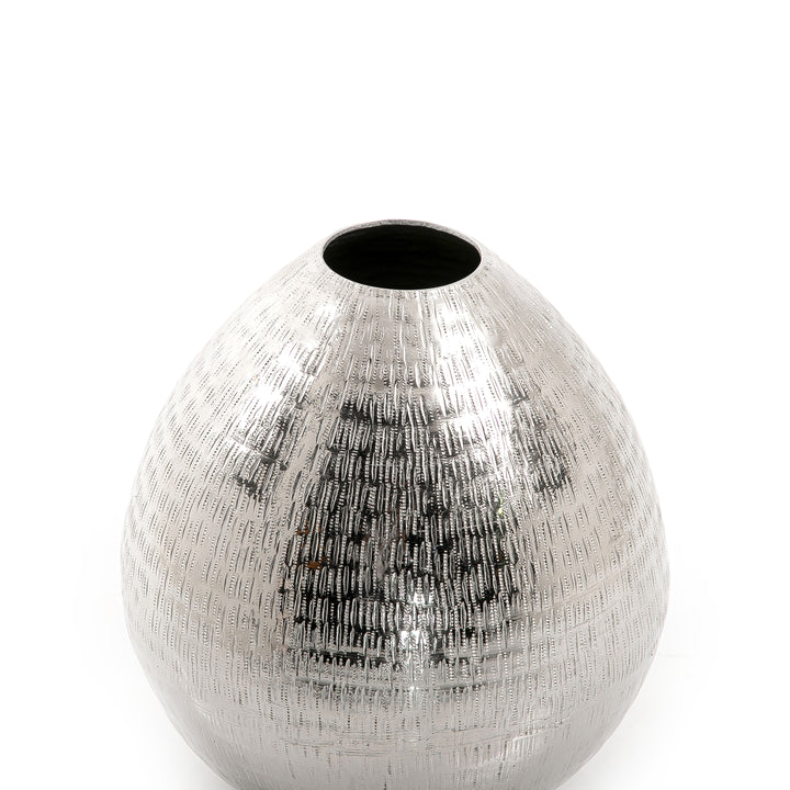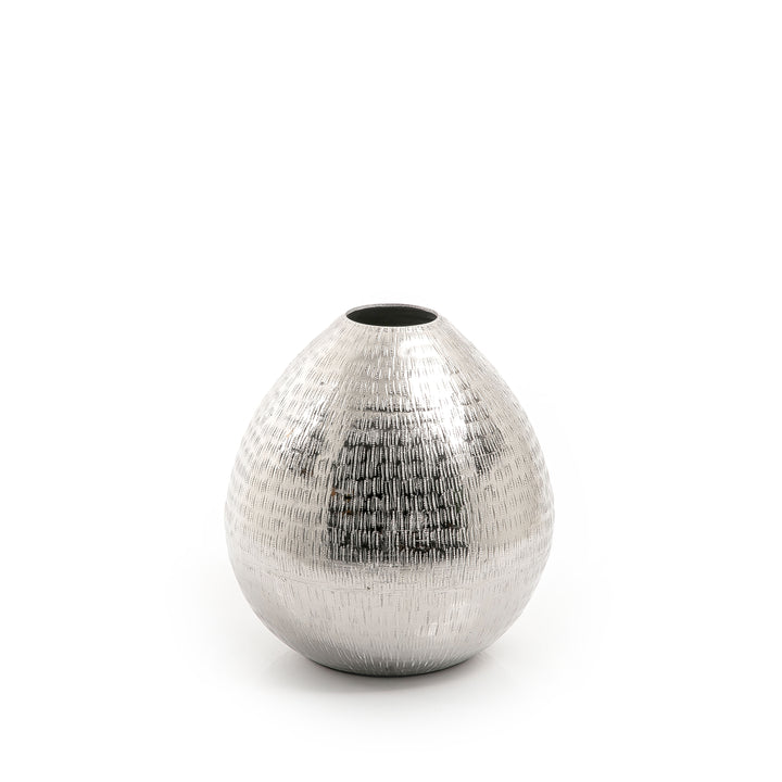 A sleek silver metal vase that adds a contemporary touch to your home or office decor. Its minimalist design and polished finish make it perfect for displaying flowers or standing alone as a stylish accent piece.