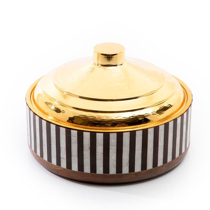 A stunning round wooden food preserver featuring a bold white and black design, topped with a luxurious gold metal cover. Perfect for keeping food fresh while adding elegance to your dining setup. A blend of modern style and practical function ,ideal for serving or gifting.