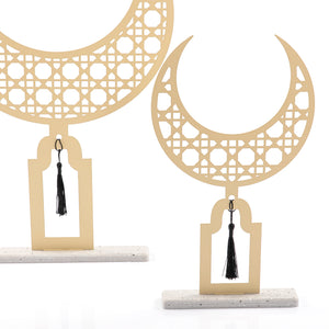 عزّزي أجواء البهجة في منزلكِ باقتناء اكسسوار رمضان الجذّاب. مصمم من استاند هلال معدن مع قاعدة رخام متين يمكنك وضعها كقطعة قائمة بذاتها كزينة رمضانية في منزلك