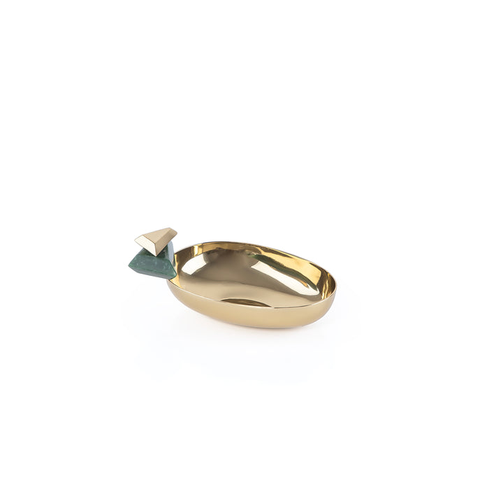 وعاء تقديم أنيق من الستانلس ستيل اللامع مزين بلمسات ذهبية و خضراء لإطلالة عصرية فخمة. مثالي لتقديم المكسرات والوجبات الخفيفة