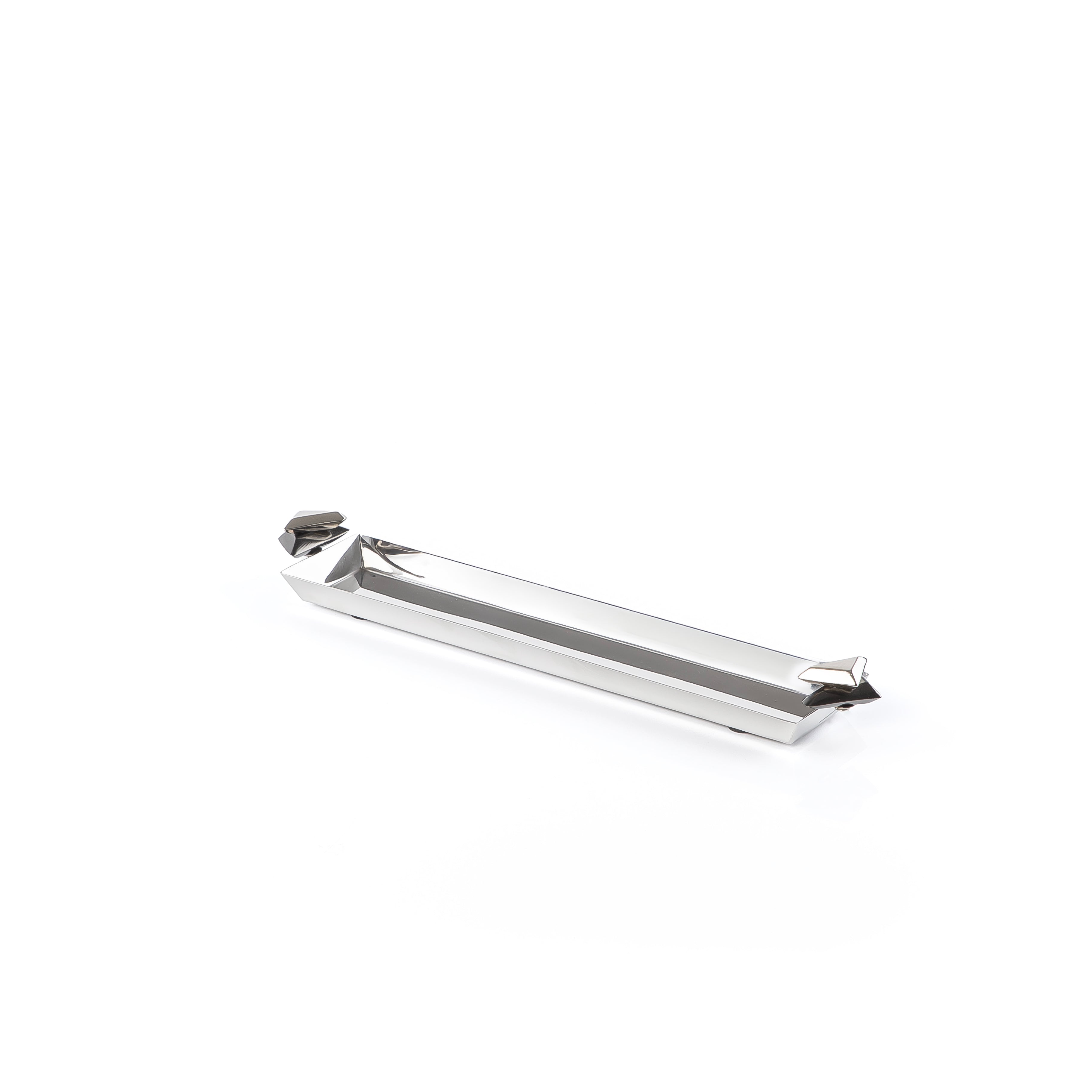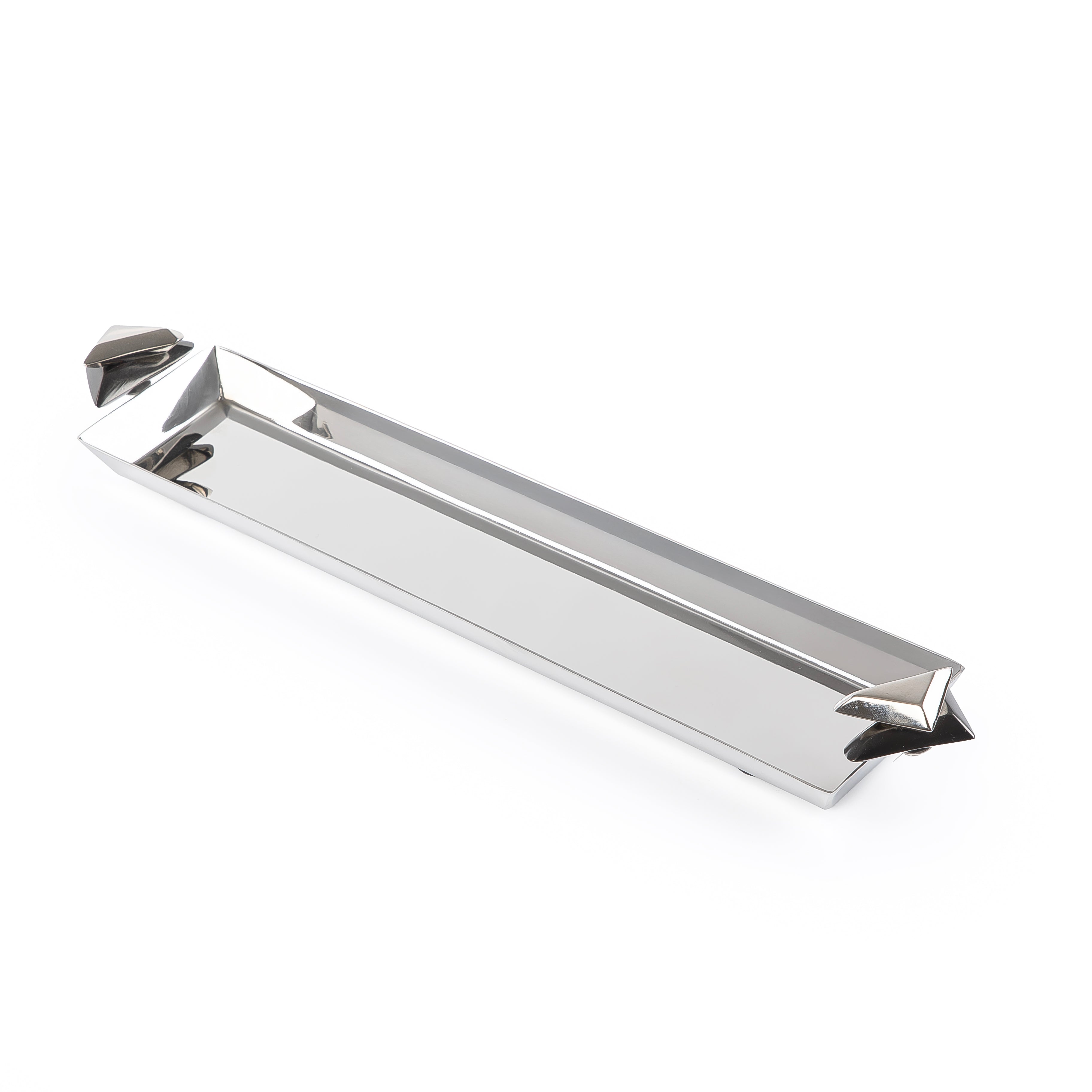 ارتقِ بعرض مائدتك مع هذه الصينية المعدنية الطويلة الأنيقة، المصممة ببراعة وبلمسة نهائية مميزة باللونين الفضي والأسود.