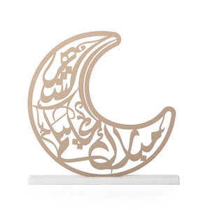 استاند أنيق على شكل هلال، عبارة عربية راقية "مبارك عليكم الشهر" من الداخل. يأتي على قاعدة متينه من الرخام الأبيض، يجمع بين الأصالة والفخامة العصرية