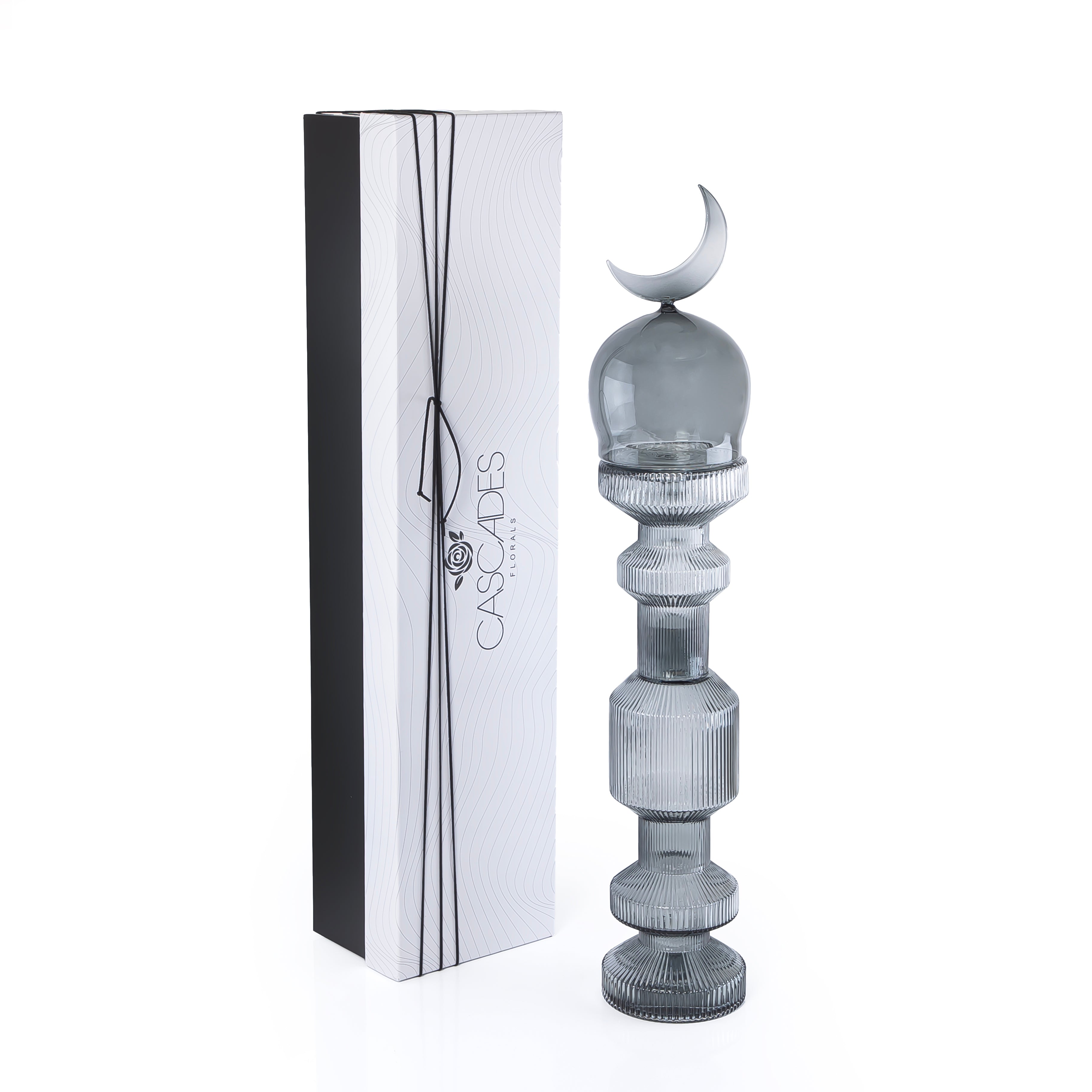 قطعة ديكور زجاجية علي شكل مأذنة حجم وسط مع بوكس هدايا - رمادي