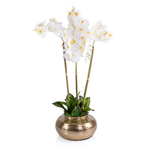 أضف لمسة من الأناقة إلى ديكور منزلك مع مزهرية المعدن الذهبي المزينة بالأوركيد. مصنوعة من مواد عالية الجودة، تضيف هذه المزهرية لمسة من اللون والرقي في آنٍ واحد. مثالية لأي غرفة في المنزل، وستلفت الأنظار بجمالها وزهرتها الرقيقة لتترك انطباعًا مميزًا.