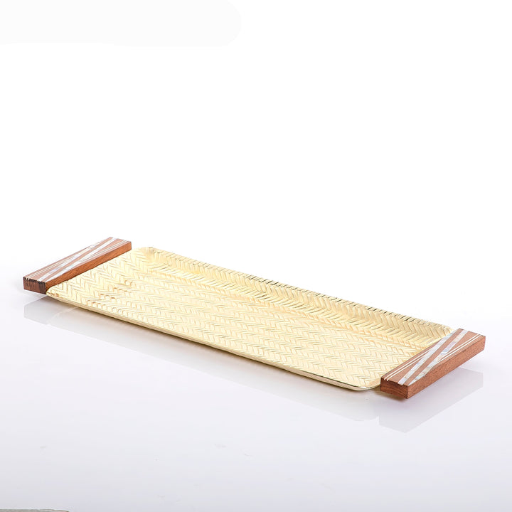صينية مستطيلة فاخرة كبيرة الحجم بلمسة ذهبية لامعة، ومقبضين خشبيين أنيقين. مثالية للتقديم أو العرض أو التزيين، تضفي لمسة جريئة وراقية على أي مناسبة أو مساحة.
