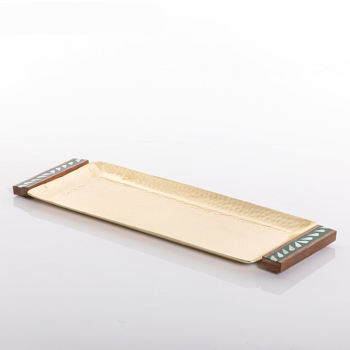 صينية فاخرة كبيرة الحجم بتشطيب ذهبي لامع، مزوّدة بمقبضين أنيقين من الموب باللون الأخضر. مثالية للتقديم أو العرض أو التزيين، وتضفي لمسة جريئة وراقية على أي مناسبة أو مساحة داخلية.