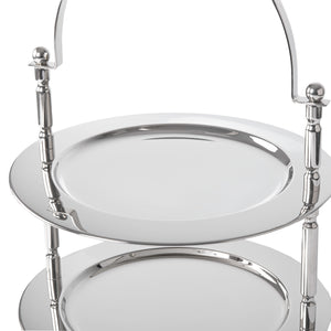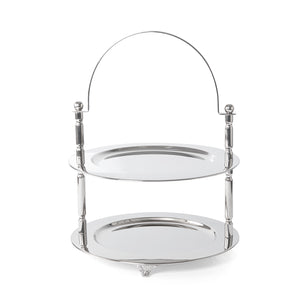 ستاند كيك ثنائي الطوابق ستانلس ستيل باللون الفضي، مثالي لعرض الطعام والحلويات. تصميمه الأنيق يضيف لمسة من الرقي إلى أي مناسبة.