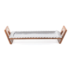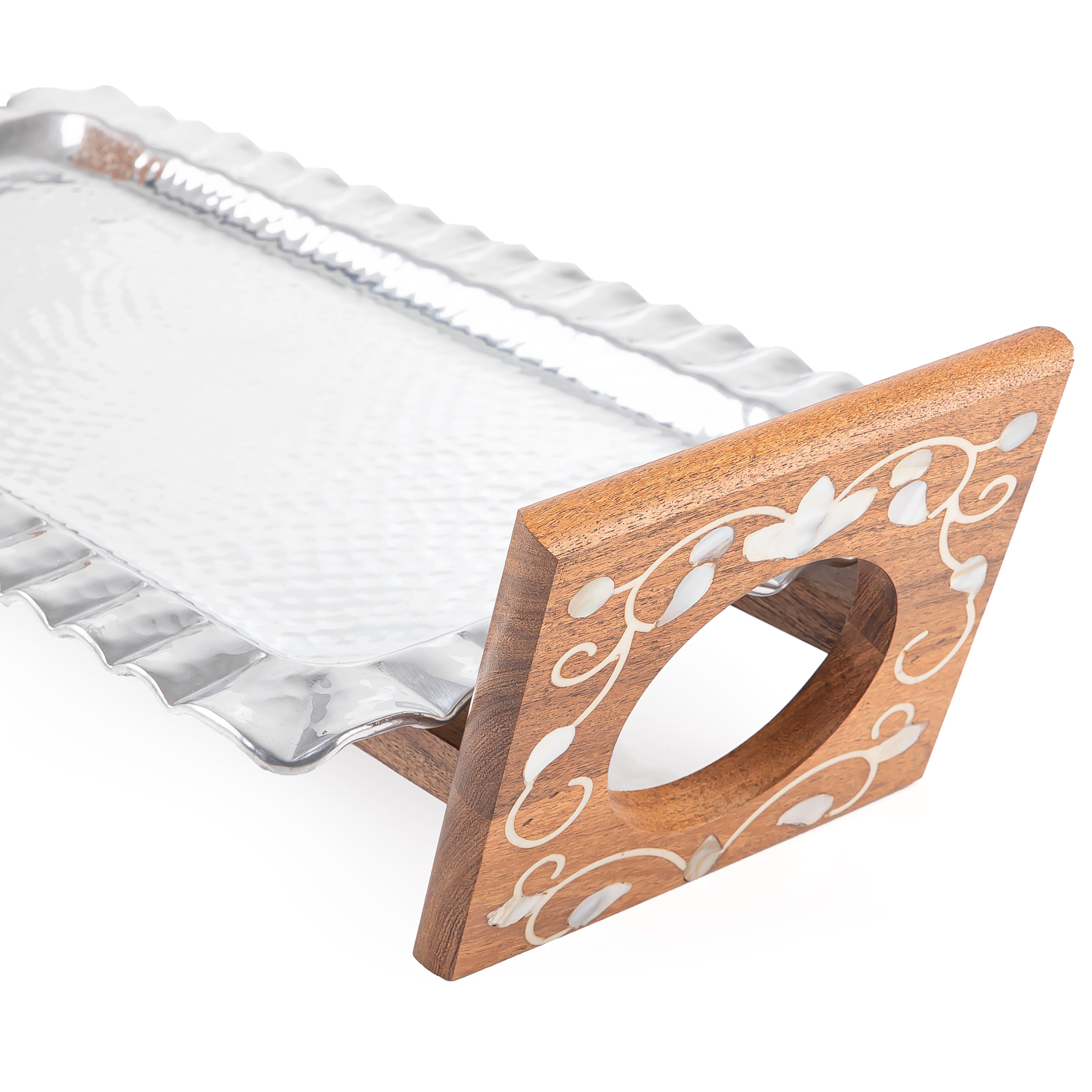 Increase your home's elegance with this rectangle Aluminium Tray with MOP wood Stand. It features a luxurious marble handle for easy carrying and a sophisticated touch. Ideal for serving or organizing, it adds both style and functionality to any space.