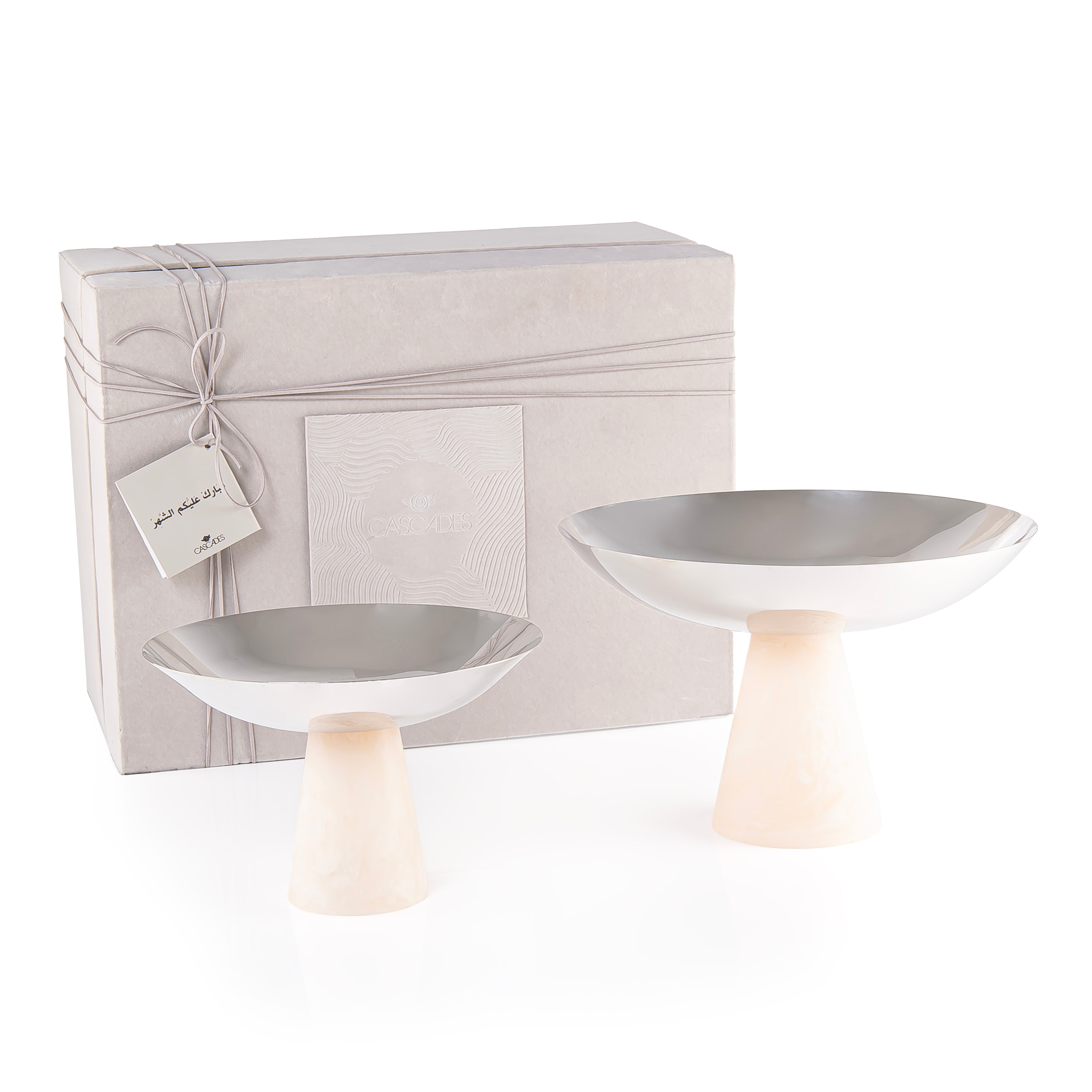 طقم 2 طبق تقديم دائري من الستانلس ستيل مع قاعدة من الريزن بتصميم مخروطي عريض وبوكس هدية