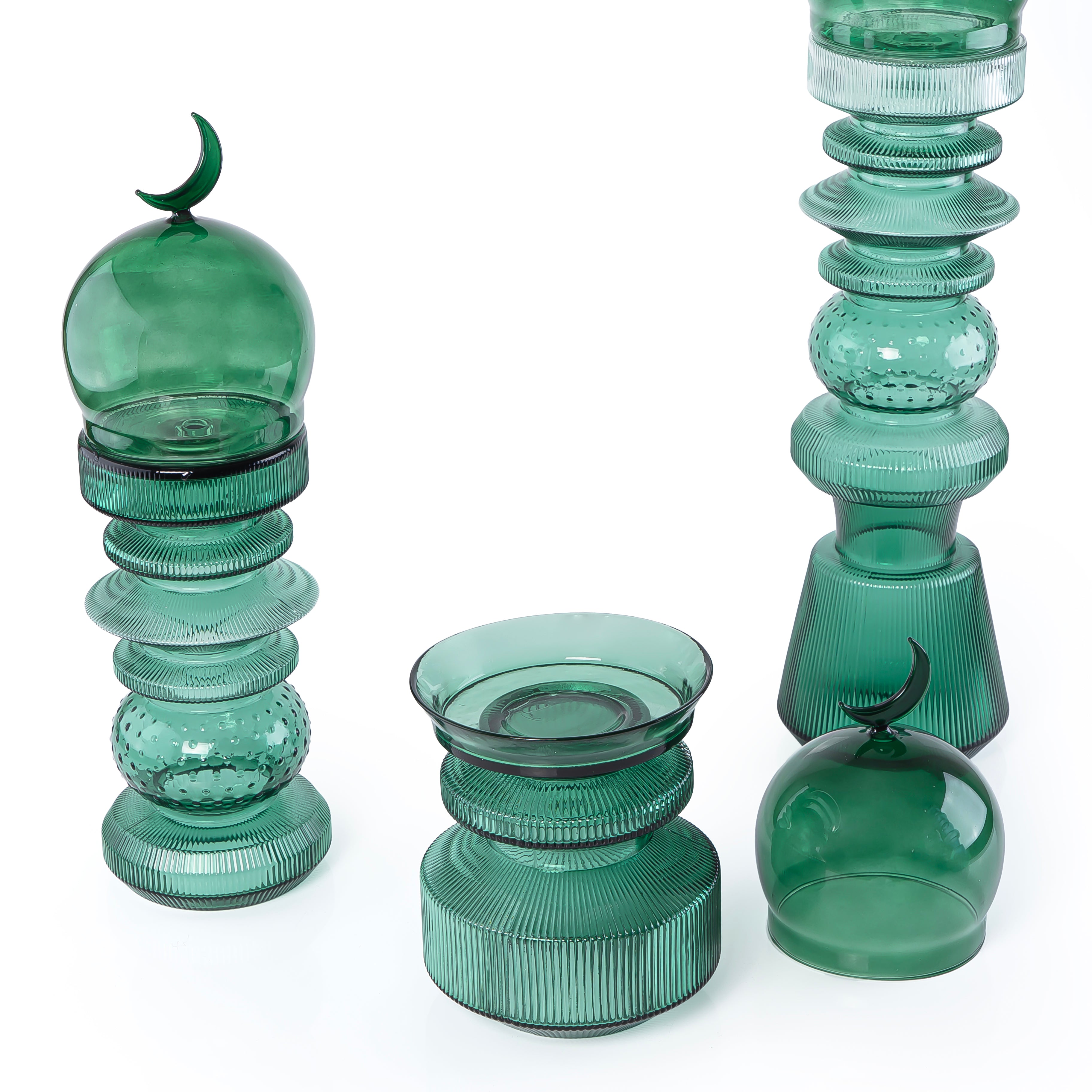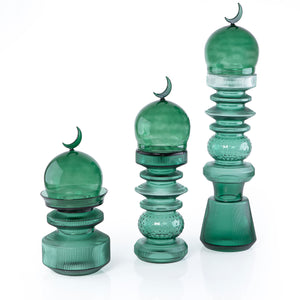 طقم زجاجي 3 قطع (2 قطعة ديكورعلى شكل مأذنة + وعاء للتمر) مع بوكس هدايا - أخضر