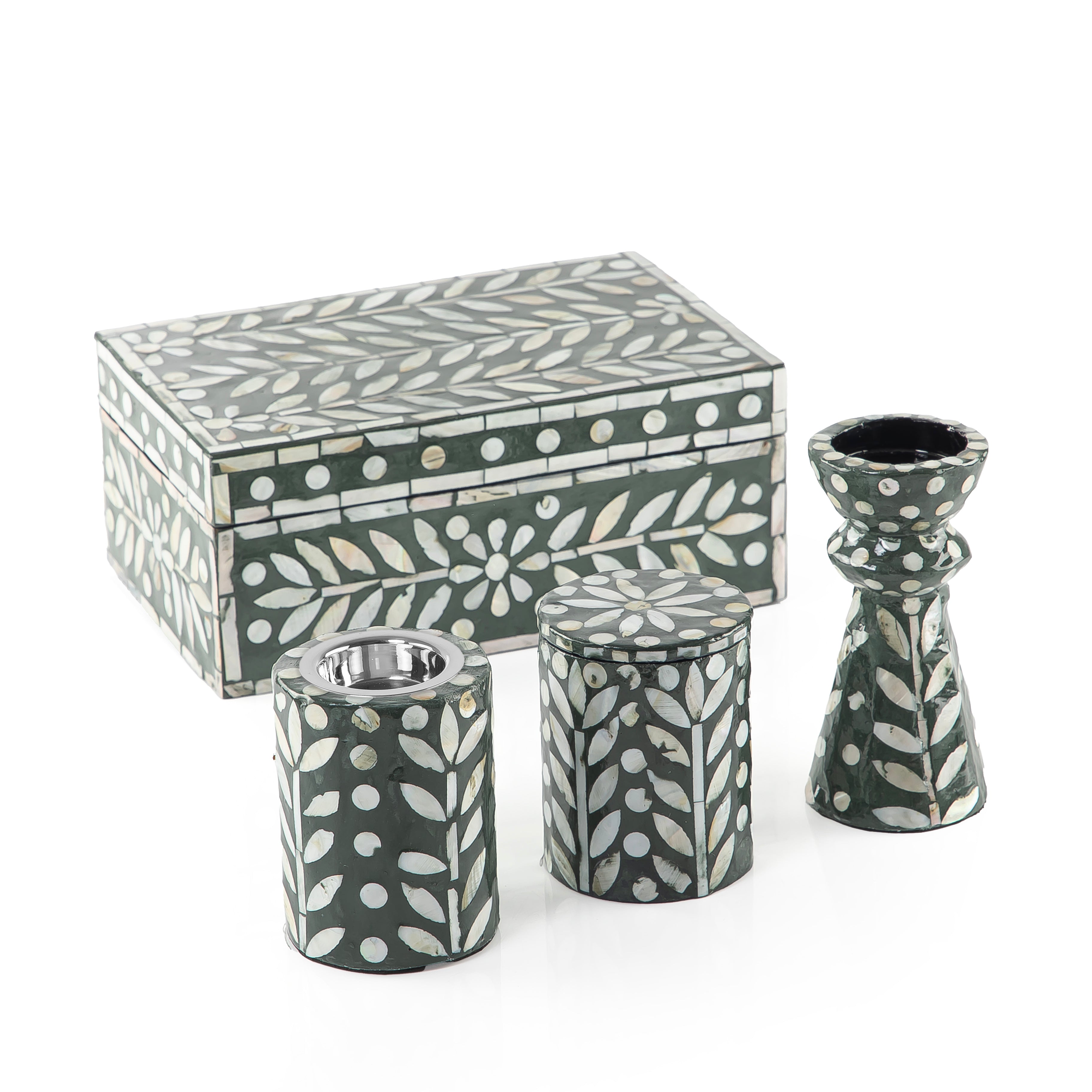 طقم صدف (مبخر + علبة بخور + حامل شموع ) في بوكس - أخضر