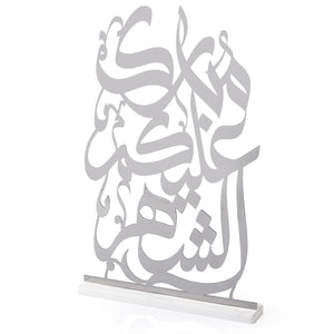 استاند أنيق على شكل هلال، عبارة عربية راقية "مبارك عليكم الشهر" من الداخل. يأتي على قاعدة متينه من الرخام الأبيض، يجمع بين الأصالة والفخامة العصرية