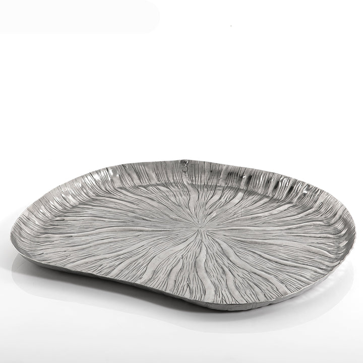 طبق معدن أنيق باللون الفضي، مثالي للتقديم أو التزيين . يتميز بتشطيب ناعم ولمعان راقٍ يضفي لمسة عصرية على أي مساحة، مناسب للاستخدام اليومي والمناسبات الخاصة.