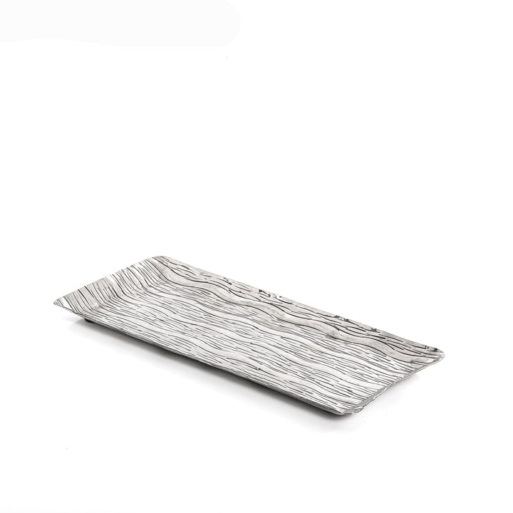 صينية معدنية مستطيلة باللون الفضي اللامع، تجمع بين الأناقة والعملية. مثالية للتقديم أو الترتيب أو عرض القطع الديكورية، وتضفي لمسة عصرية راقية على أي مساحة.