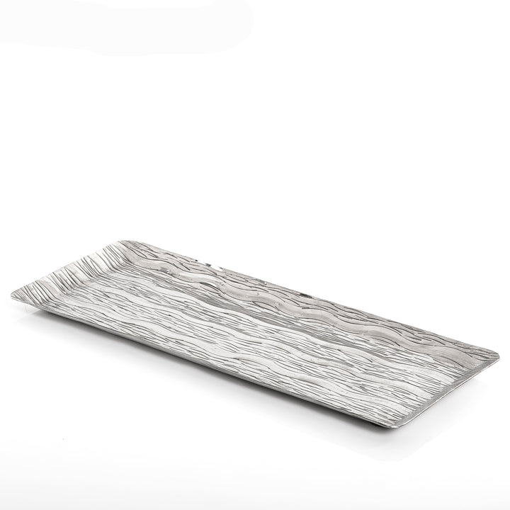 صينية معدنية مستطيلة باللون الفضي اللامع، تجمع بين الأناقة والعملية. مثالية للتقديم أو الترتيب أو عرض القطع الديكورية، وتضفي لمسة عصرية راقية على أي مساحة.