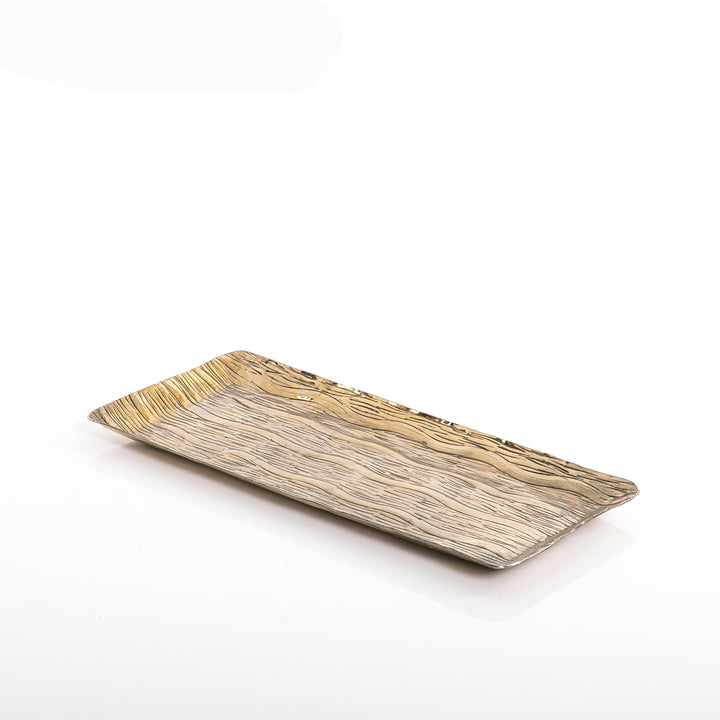 صينية معدنية مستطيلة باللون الذهبي اللامع، تجمع بين الأناقة والعملية. مثالية للتقديم أو الترتيب أو عرض القطع الديكورية، وتضفي لمسة عصرية راقية على أي مساحة.