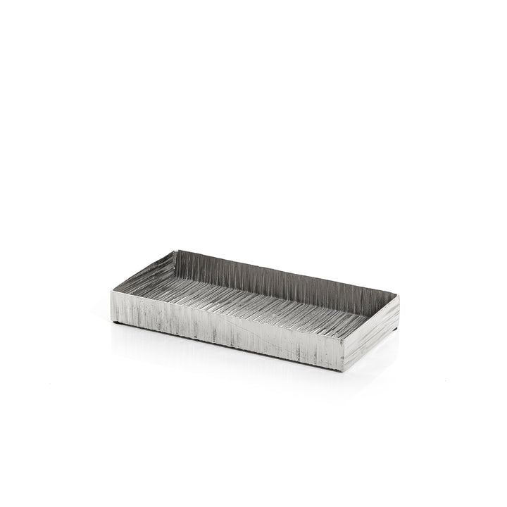 صينية معدنية مستطيلة باللون الفضي اللامع، تجمع بين الأناقة والعملية. مثالية للتقديم أو الترتيب أو عرض القطع الديكورية، وتضفي لمسة عصرية راقية على أي مساحة.