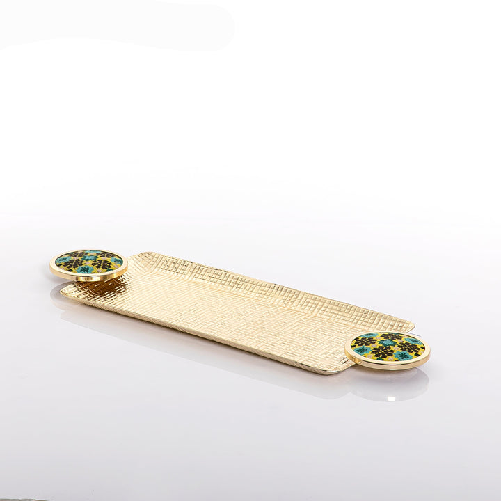 صينية أنيقة بتصميم مستطيل باللون الذهبي، مزودة بمقبضين معدنيين دائريين لسهولة الحمل ولمسة عصرية مميزة. مثالية للتقديم أو الترتيب أو عرض القطع الديكورية، وتضفي طابعًا راقيًا على أي مساحة.