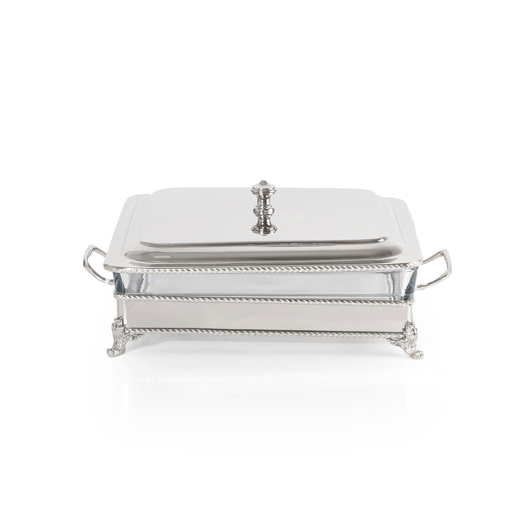 ارتقِ بتجربة تقديم الطعام مع سخان الطعام المستطيل المصنوع من الستانلس ستيل الفضي، المزود بوعاء زجاجي داخلي قابل للإزالة لمرونة التقديم وسهولة التنظيف.