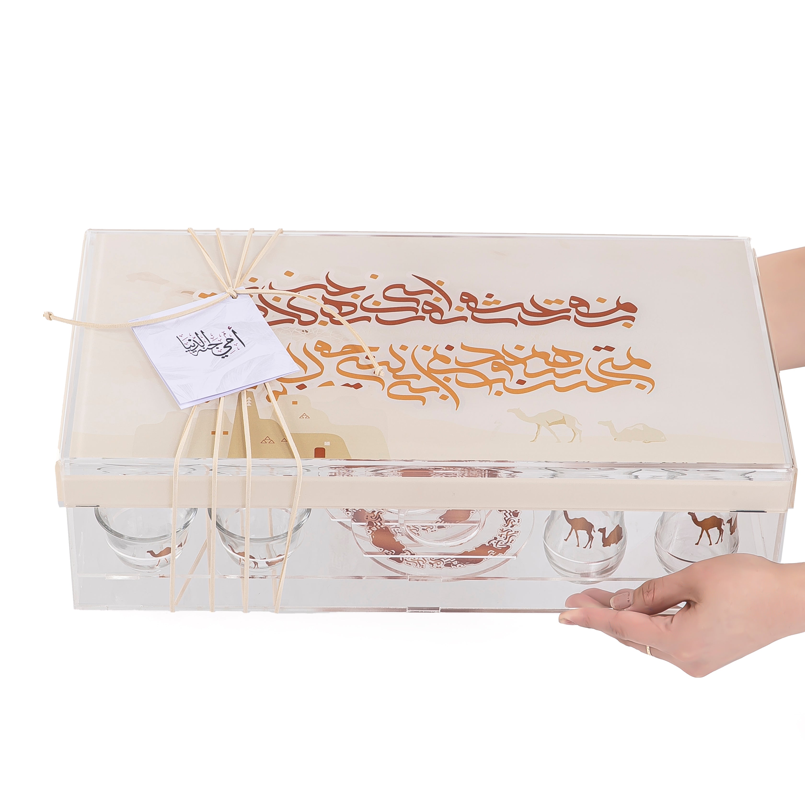 يتميز هذا الصندوق الأكريليكي الشفاف بغطاء أنيق بتصميم مطبوع عليه أشعة فوق البنفسجية باللونين البيج والبني. يحتوي على: